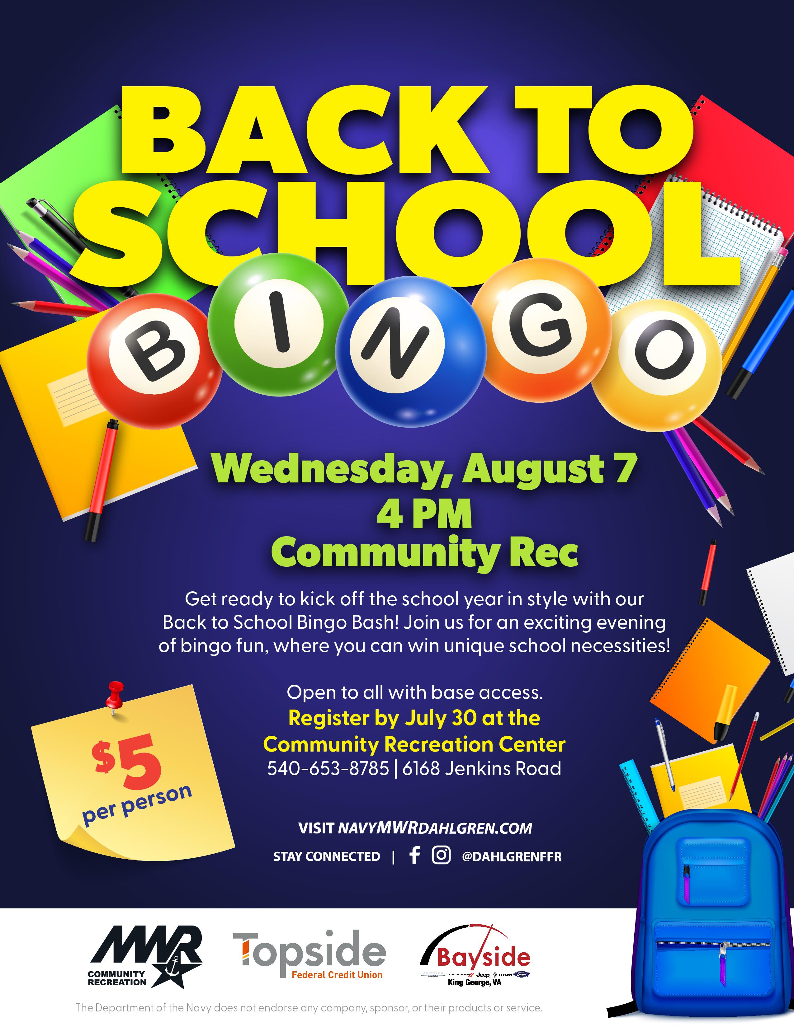 Need some new supplies before the start of the school year? Play some bingo and win school supplies at the Back to School Bingo Bash! Bingo will be held at Community Rec, BLDG 106, starting at 4 p.m.
